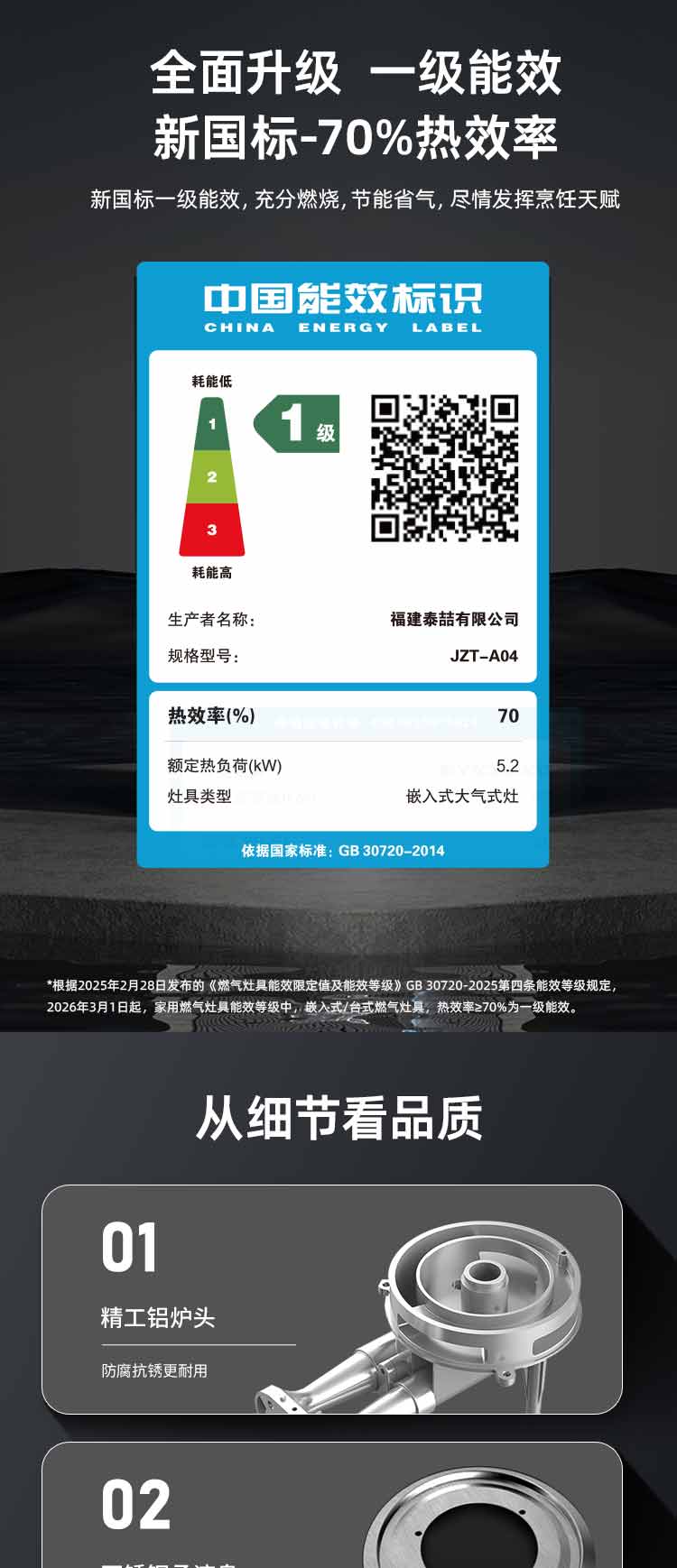 2. 热效率70%,一级能效(新国标):高效节能环保