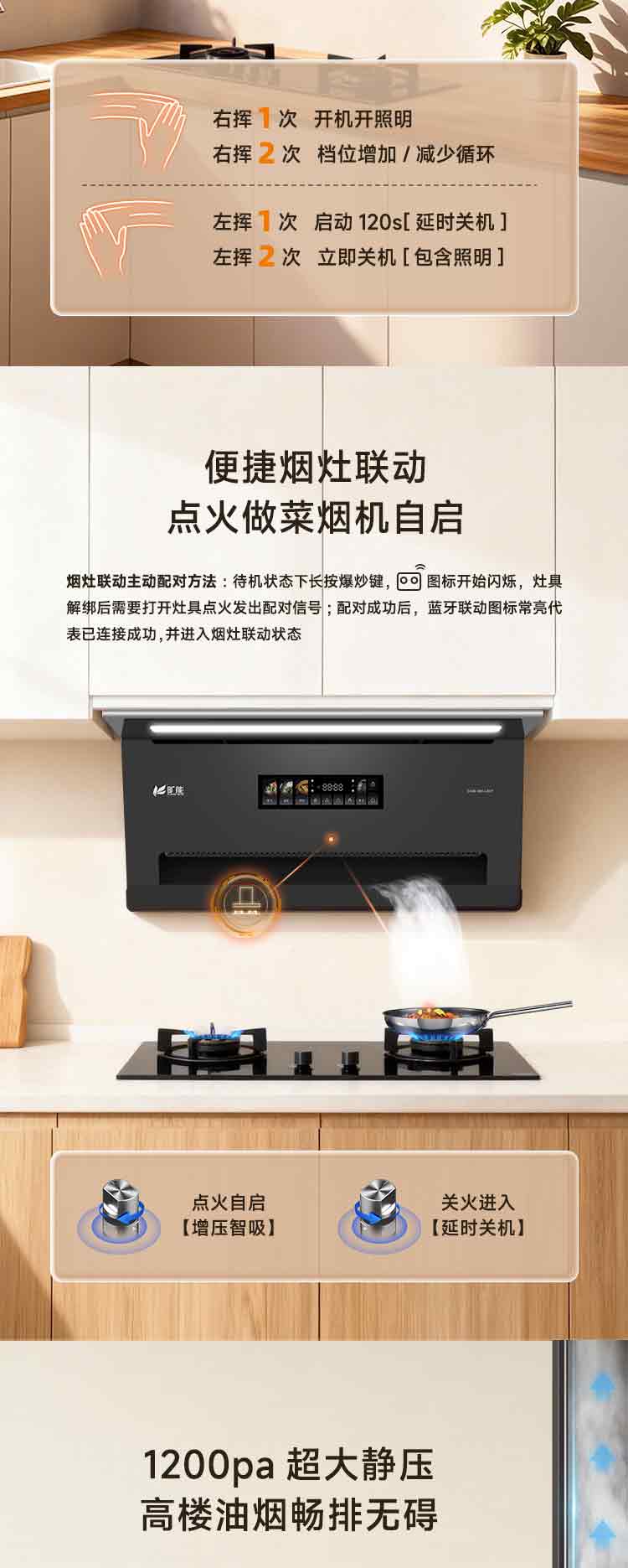 - 1.智能体感开关,时尚新颖,挥手智控,延时关机,操作方便,彻底清除厨房废气余烟