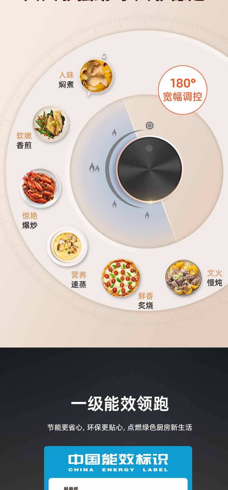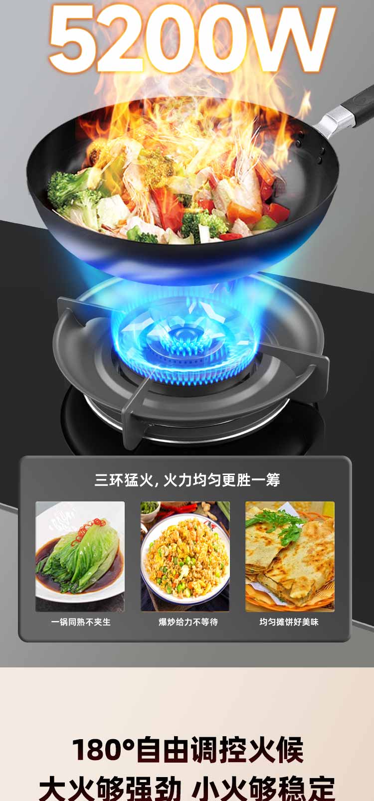 - 4.一键爆炒:瞬间火力到5.5KW,烹饪更高效,减少燃气消耗,可持续180S