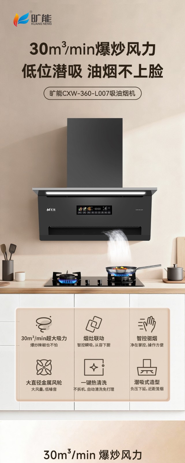 2.爆炒30㎥/min风量,瞬间吸烟,清爽烹厨
